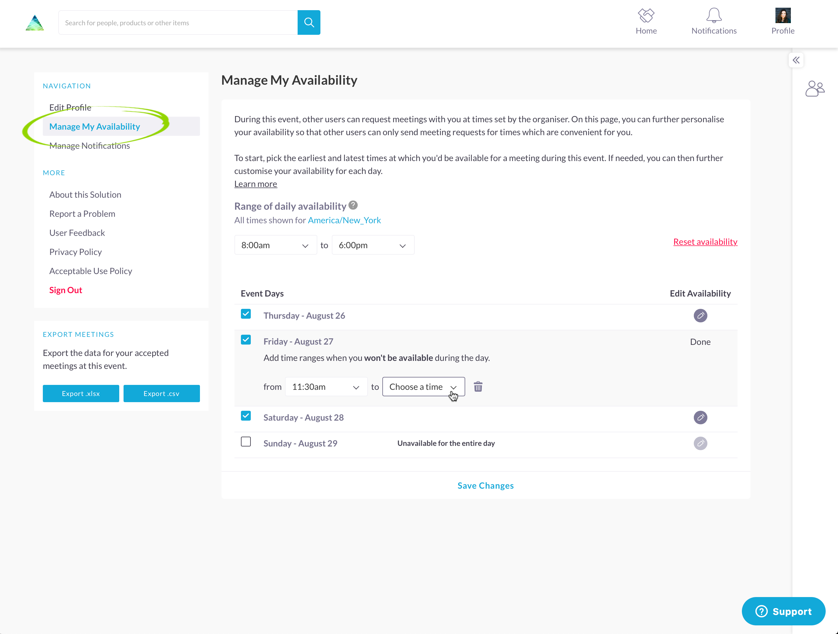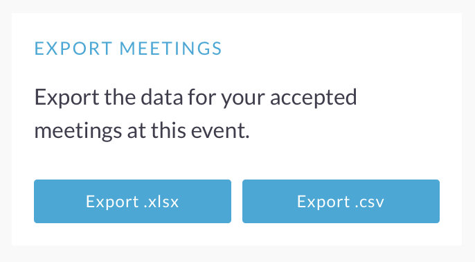 A list of the connections you have accepted meetings with, including the profile details for those connections, can be exported from your Matchmaking profile by selecting the Export .xlsx or Export .cvs button in the left menu. If they have allowed sharing their email address and phone number, this information will also appear in the export.