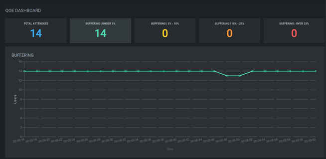 The QoE Dashboard displays a real-time breakdown of the “health” (overall connectivity and streaming success) of your attendees over the span of your live webcast. This graph breaks down the audience into 4 buffering categories and colors: