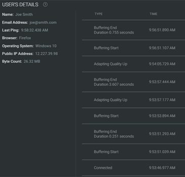 Drilling further into an attendee brings up the Attendee User Detail view, which provides diagnostic information at a granular level for the attendee’s current connection session.