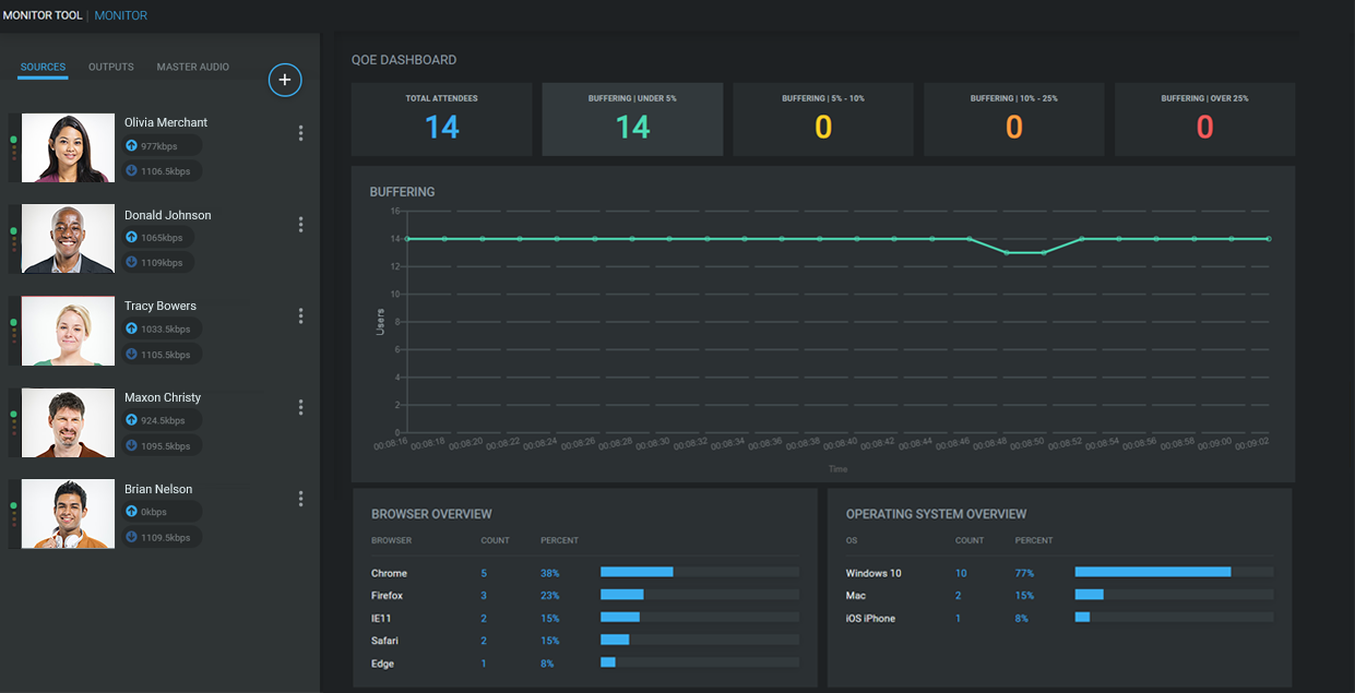 The Monitor Tool provides real-time tracking of individual attendee connections to better diagnose any technical issues within the webcast. These insights will help organizers adjust content delivery to give the audience the best viewing experience.