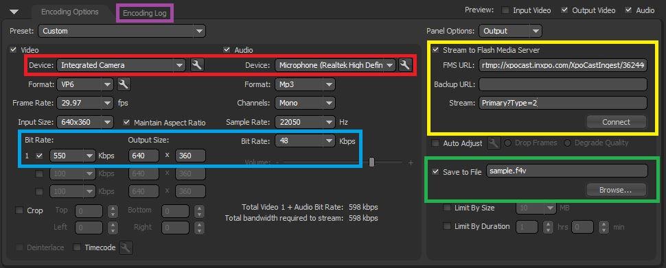 • Enter the “FMS URL” and “Stream” information as provided by INXPO. This area is highlighted above in yellow.