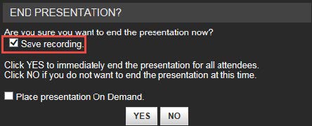 9. You will be prompted with a new window asking if you would like to end the stream. To save the recording, make sure you leave the “Save Recording” box checked. If you would like to place the presentation on demand right away check the box labeled “Place presentation On Demand”.