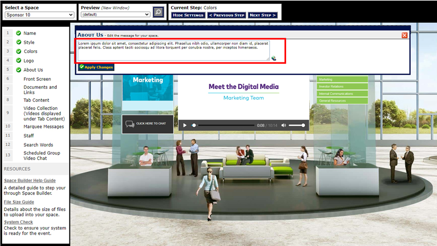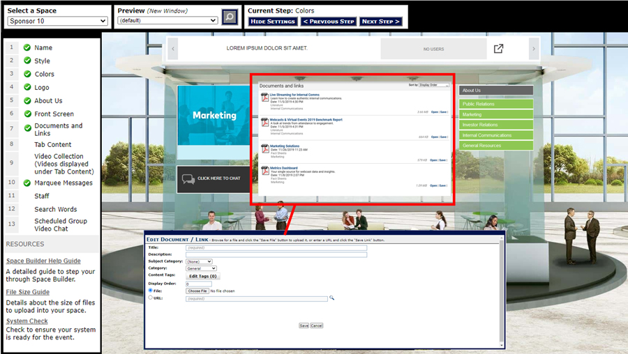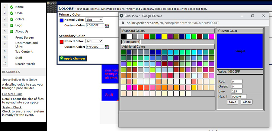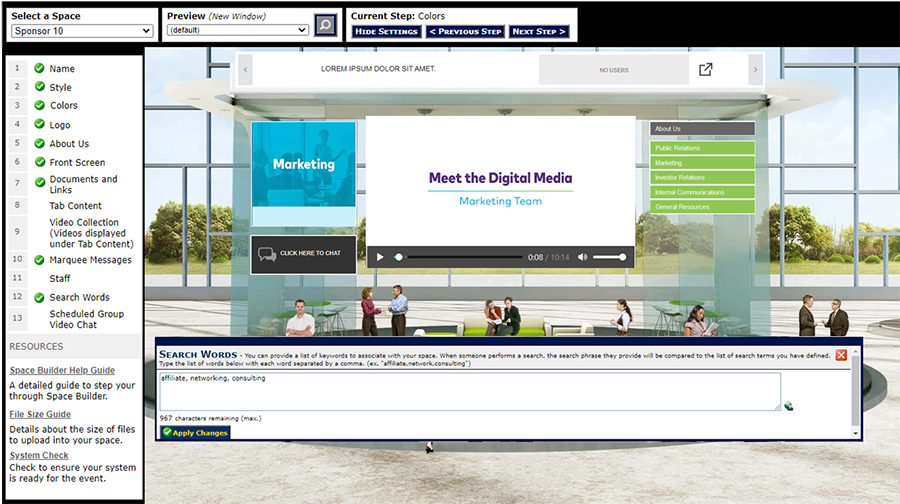 Note: You can go back and edit any step at any time during the space building process. If you change the sponsor space style at a later date/time, these color selections will remain and be applied accordingly to the new space style that you use.