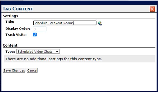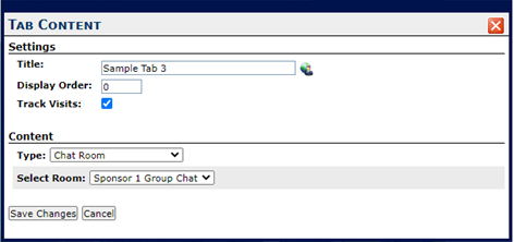 Note: If your sponsor space layout has a chat room enabled, there will be an additional tab that expands to display the chat room. A chat room added in the Tab Content step will list the chat room title in the “Content” tab. These two chat room display areas can be set up to link to different chat rooms or the same chat room.