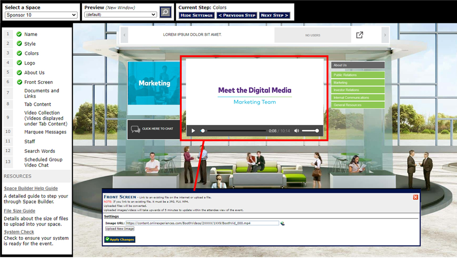 This step allows you to add an image or short video clip to your sponsor space. The front screen is one of the first things that an attendee’s eye is drawn to before they begin exploring the rest of your space. Thus, we encourage you to make this feature as exciting as possible. Please refer to the Format & Requirements guide for the accepted file formats and other technical specifications.